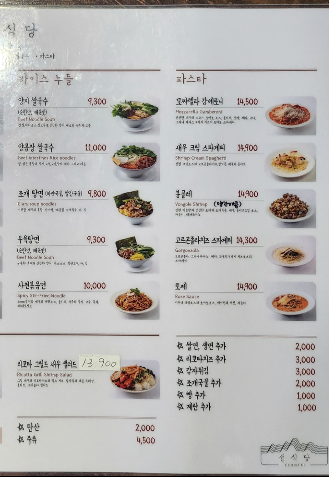 메뉴는 크게 밥, 튀김, 면, 파스타, 샐러드