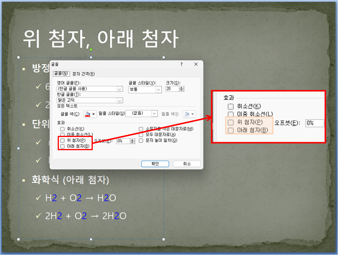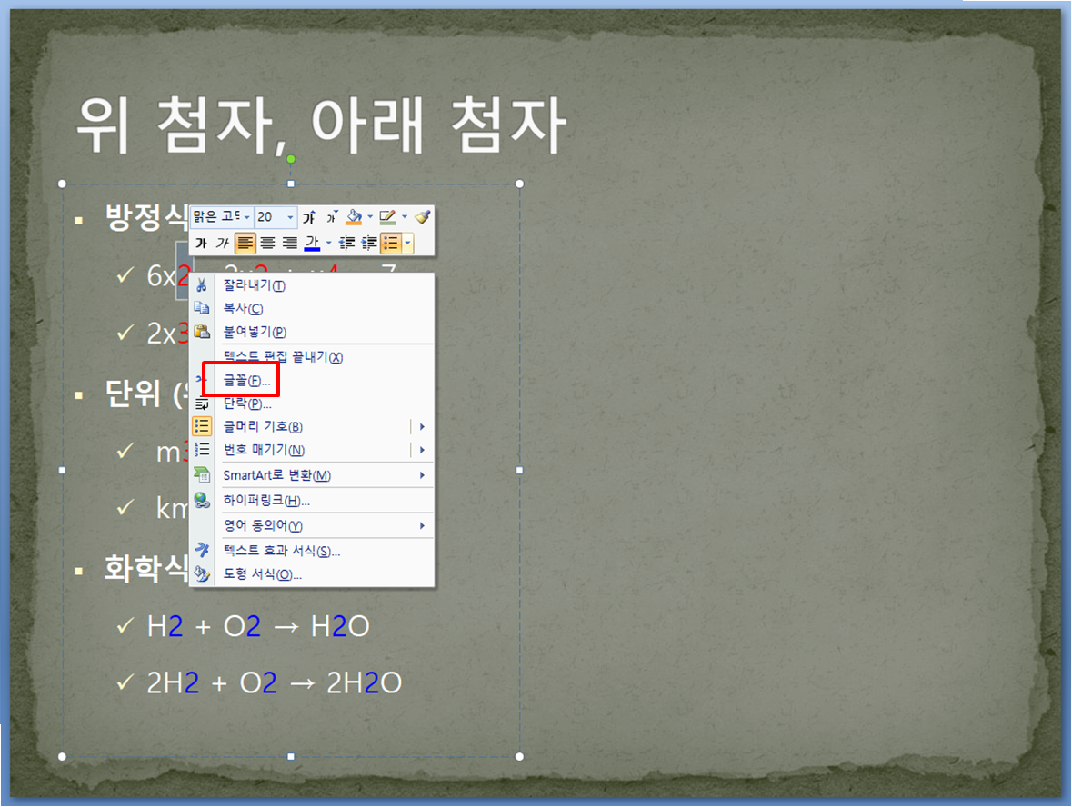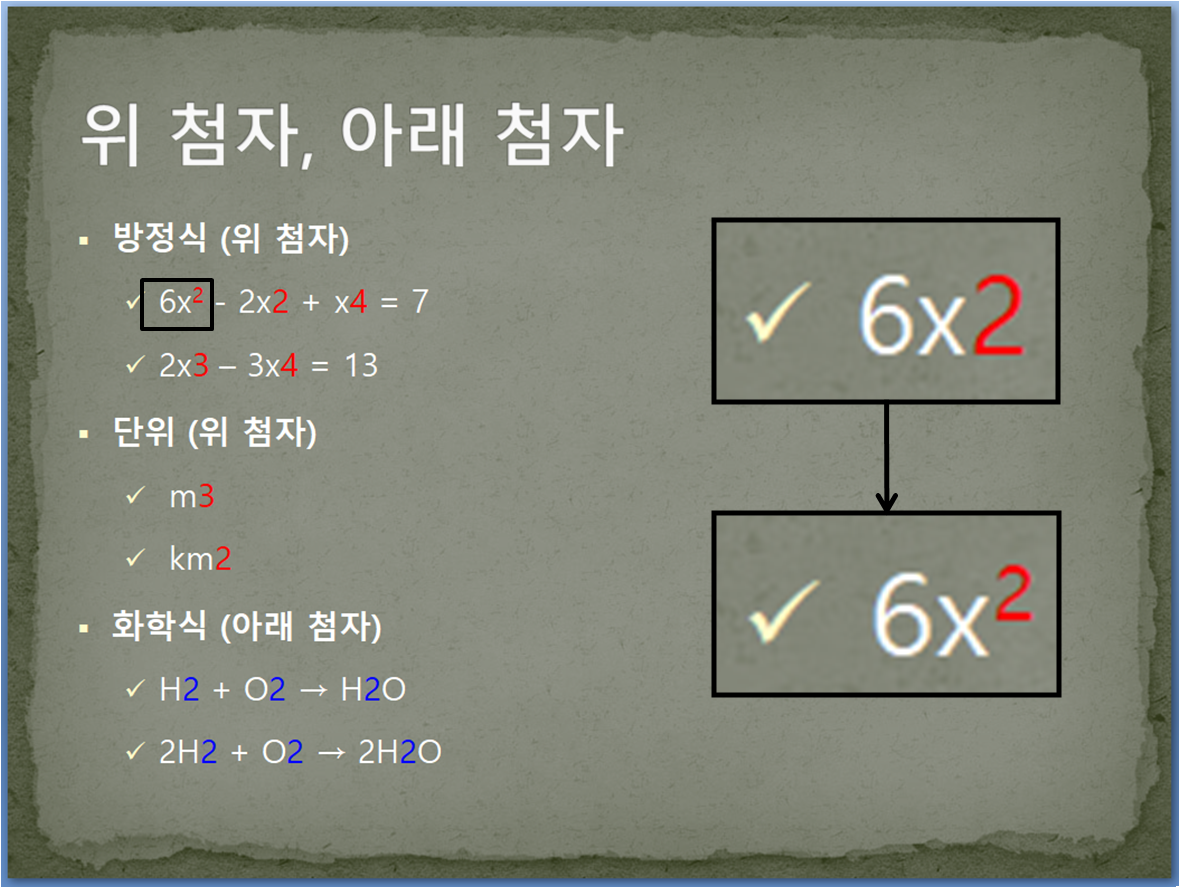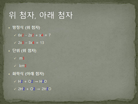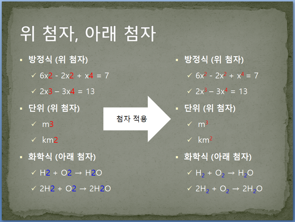 오늘은 파워포인트에서의 첨자 적용에 대해