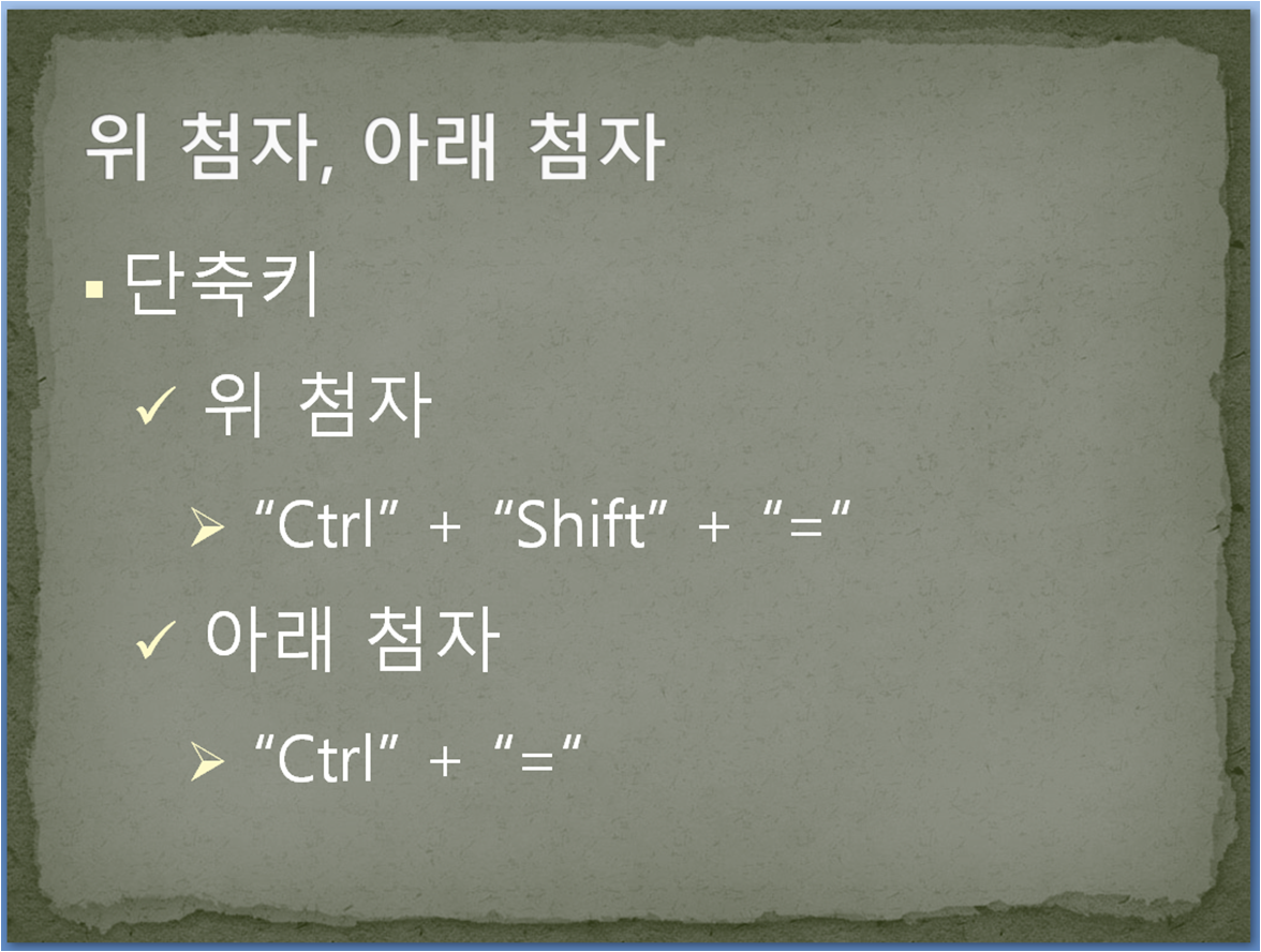위 첨자는 "Ctrl" + " Shift" + "=" / 아래 첨자는 "Ctrl" + "="